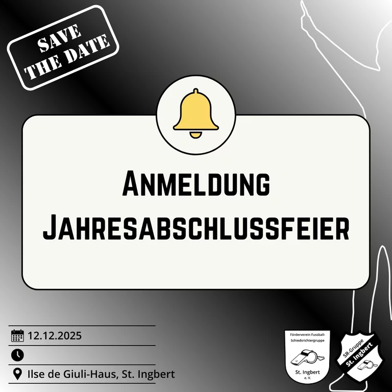 Die Jahresabschlussfeier findet dieses Jahr am 12.12.2025 im Ilse de Giuli-Haus der Lebenshilfe Saarpfalz in St. Ingbert statt. Wir freuen uns, gemeinsam mit unseren Referees das Jahr Revue passieren zu lassen und traditionell unsere Jubilare zu ehren. Anmeldungen nimmt unser Gruppenobmann Sebastian Ikas sowie unser Vorsitzender Raffaele Veneroso entgegen.